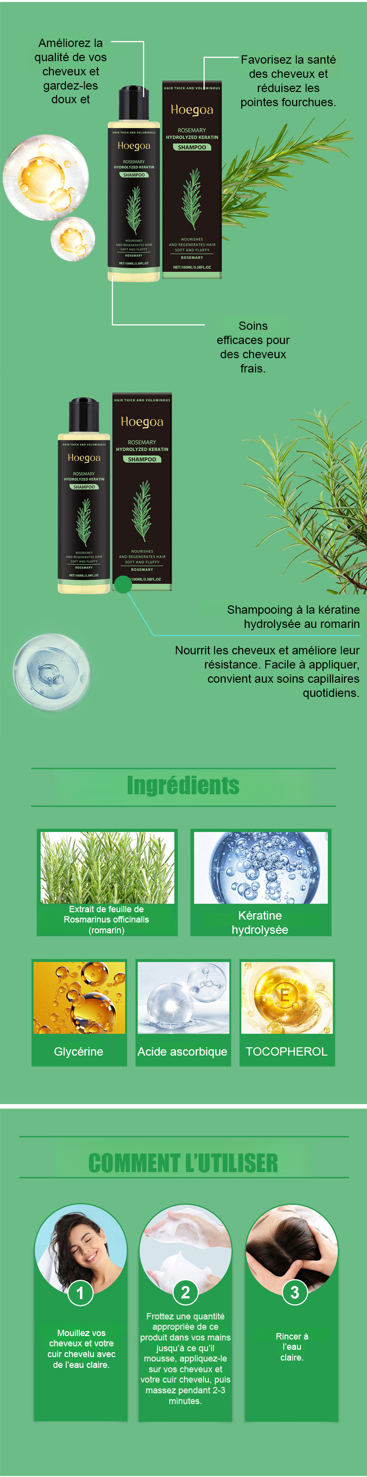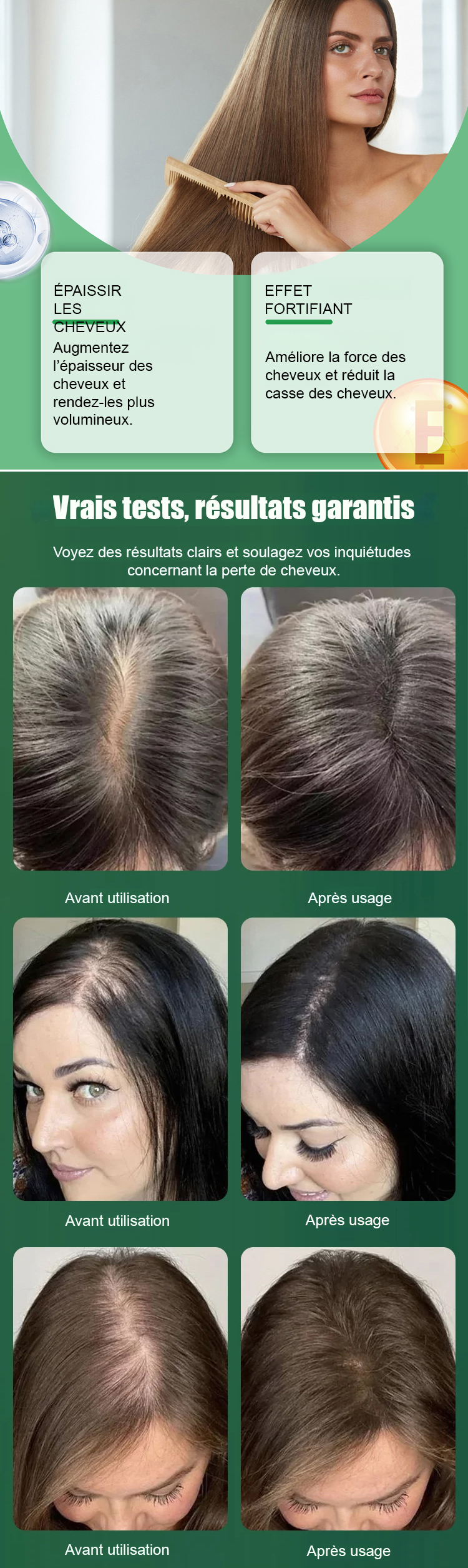 Première respiration du cuir chevelu, élimination du sébum ; réduction de la chute des cheveux dès le 7e jour ; cheveux plus épais et ligne frontale abaissée de 2 cm après une seule cure ! Garantie de qualité de 10 ans + remboursement intégral en cas d’inefficacité.