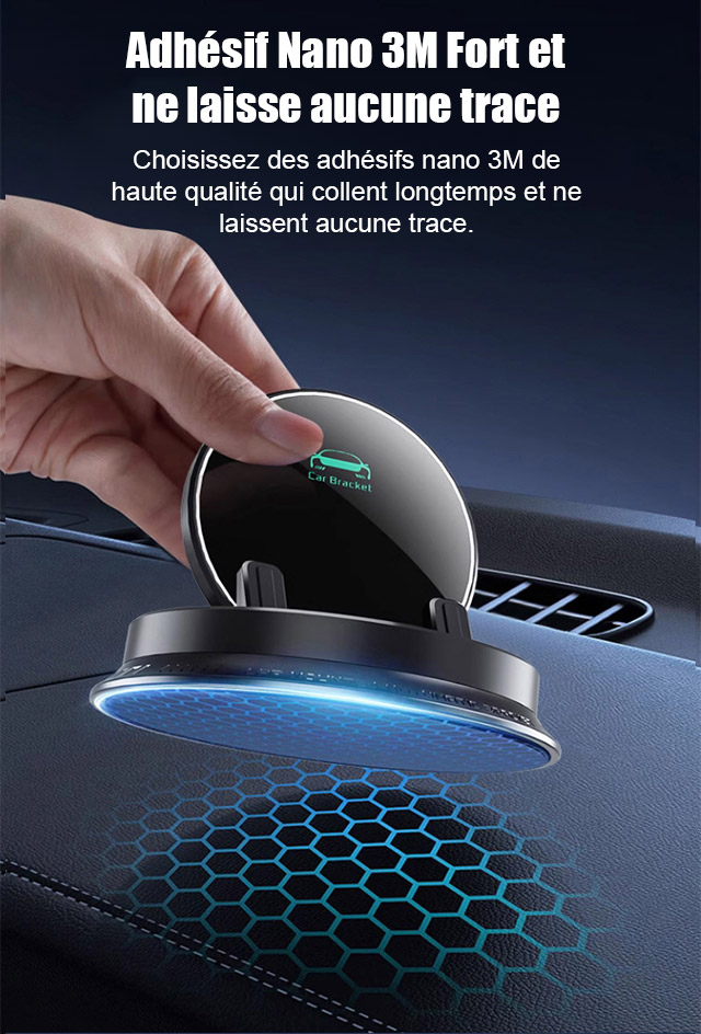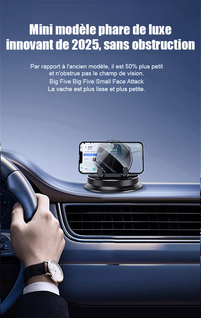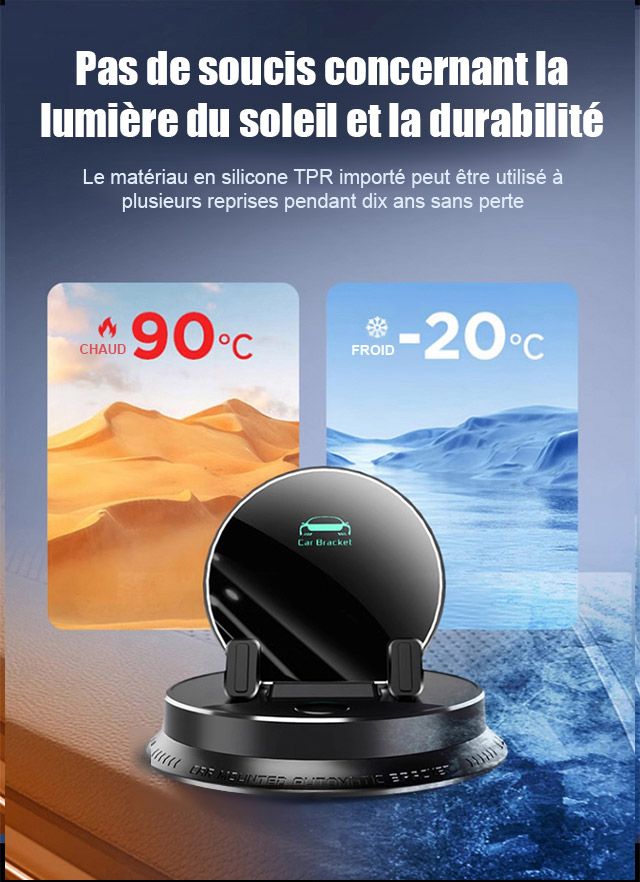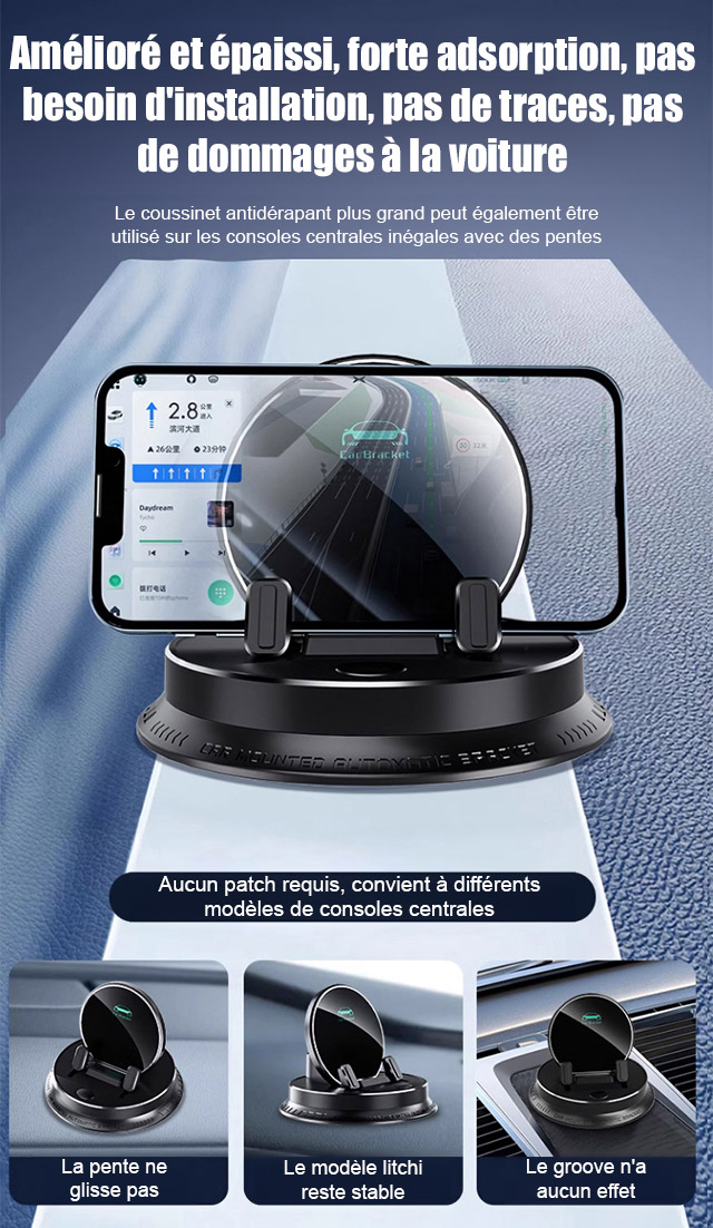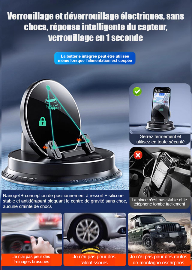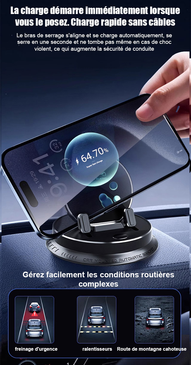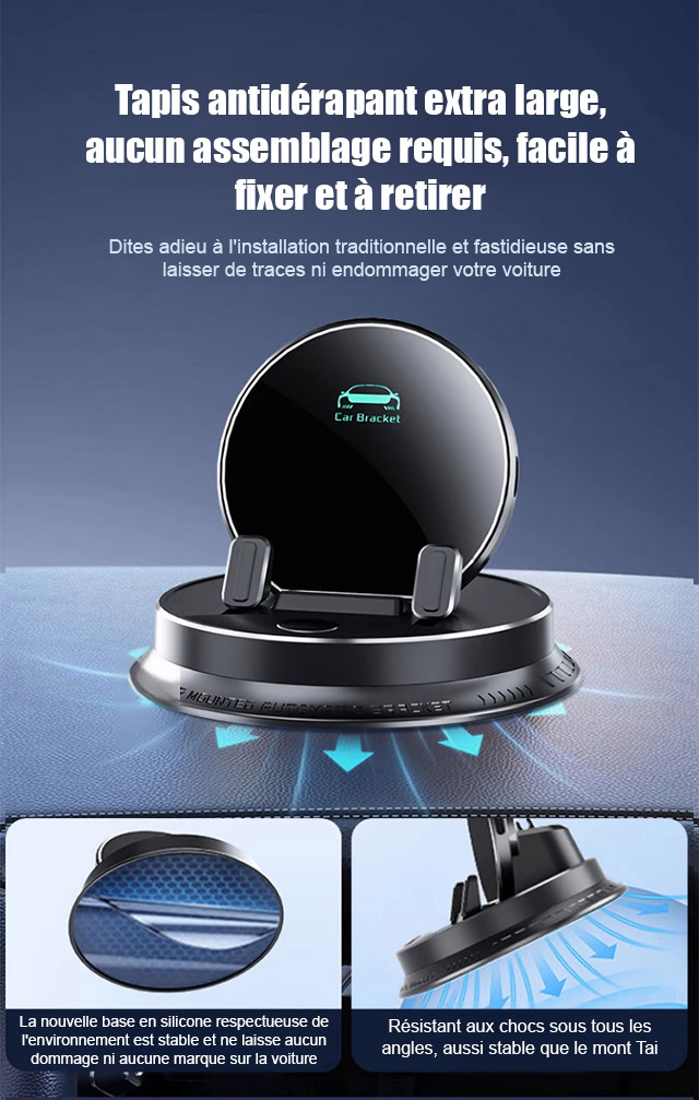 Ce bijou technologique utilise une fixation suspendue innovante. Il ne bloque pas la sortie d'air et ne laisse aucune trace sur le tableau de bord. Il s'adapte parfaitement à tous les modèles de voitures. Recouvert de silicone antidérapant de qualité médicale, il verrouille automatiquement votre téléphone dès que vous le posez. Même sur un chemin de terre rempli de graviers, votre écran reste totalement immobile.