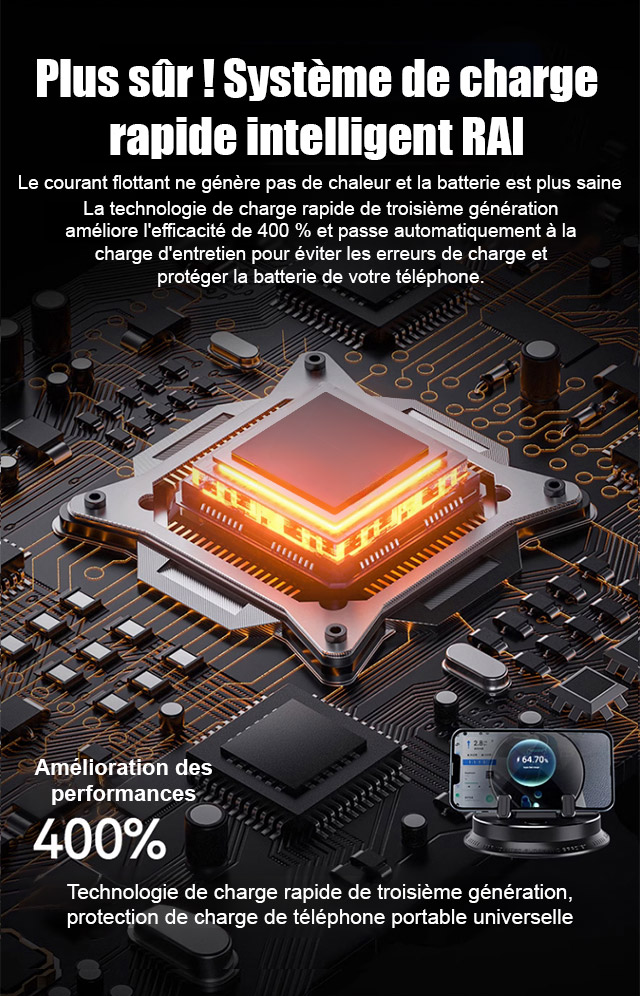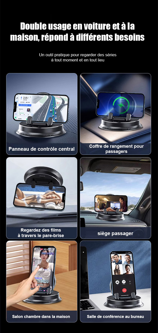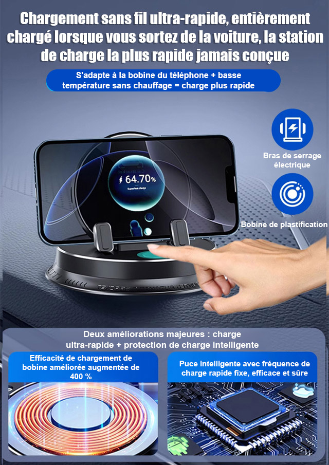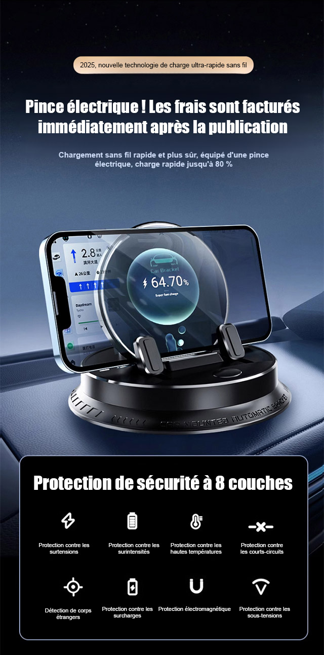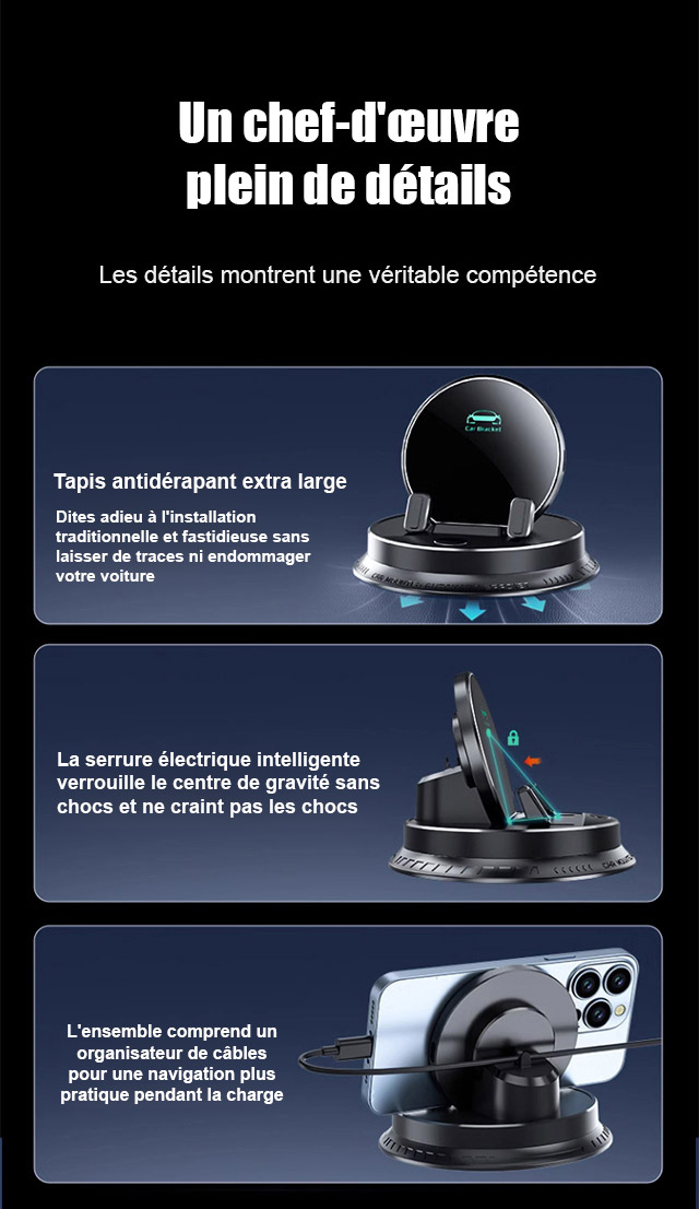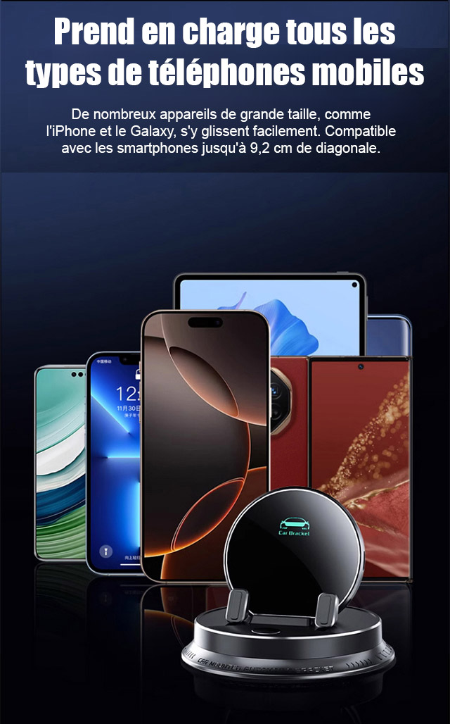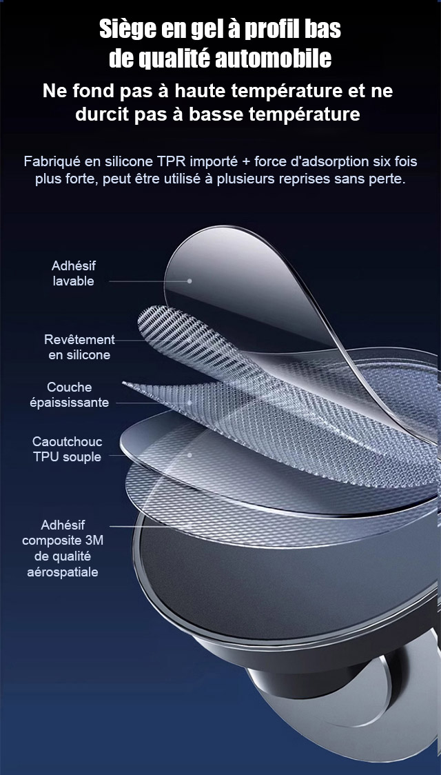 Ce bijou technologique utilise une fixation suspendue innovante. Il ne bloque pas la sortie d'air et ne laisse aucune trace sur le tableau de bord. Il s'adapte parfaitement à tous les modèles de voitures. Recouvert de silicone antidérapant de qualité médicale, il verrouille automatiquement votre téléphone dès que vous le posez. Même sur un chemin de terre rempli de graviers, votre écran reste totalement immobile.