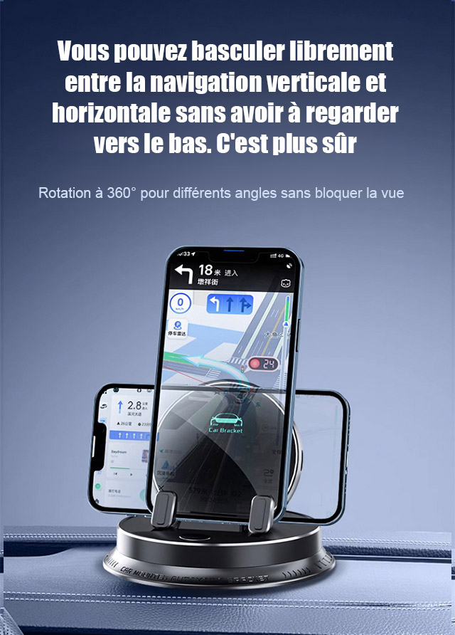 Sa rotation à 360 degrés vous permet de garder les yeux parallèles à la route. Vous ne baisserez plus jamais la tête pour conduire. Le silicone souple et épais protège votre appareil contre les rayures.
